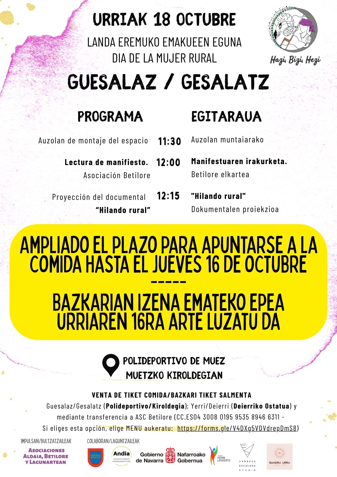 🎟 Bazkarirako tiketak eros ditzakezu Deierriko Ostatuan, El Salón de Muez tabernan edo transferentzia bat egin Betilore Elkarteari ES04 3008 0195 9535 8946 6311, transferentzia bidez egiten baduzu, bete hurrengo inprimakia zure menua aukeratzeko: https://forms.gle/V4DXg5VDVdrepDmS8