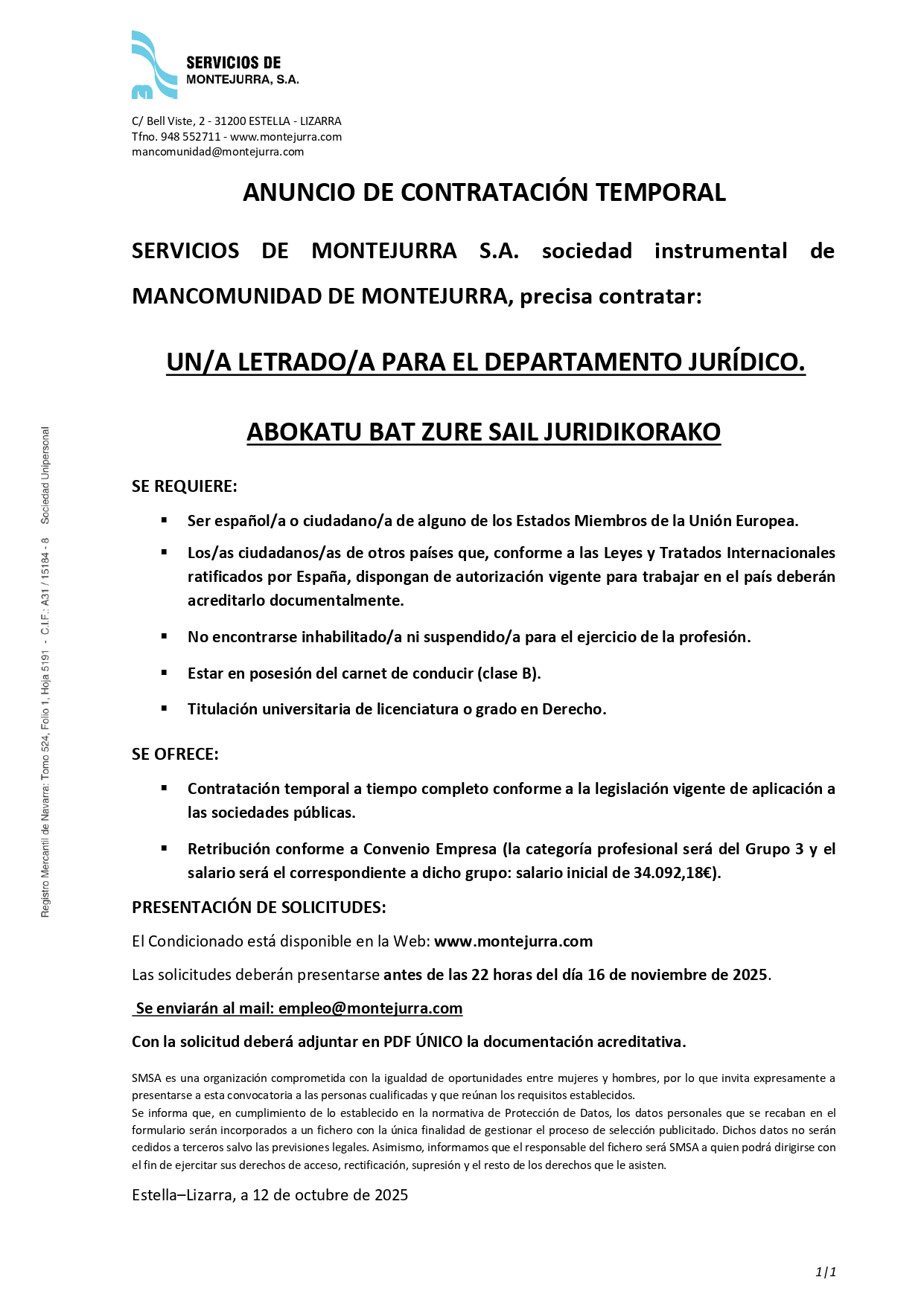 SERVICIOS DE MONTEJURRA S.A. sociedad instrumental de MANCOMUNIDAD DE MONTEJURRA, precisa contratar: