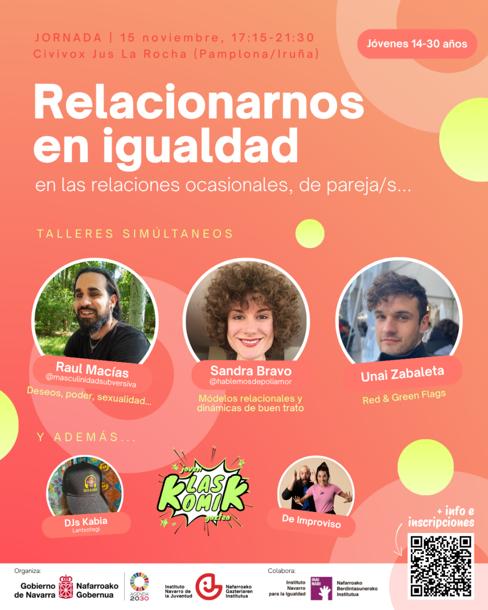 El Instituto Navarro de la Juventud, con la colaboración del Instituto Navarro para la Igualdad, organiza esta jornada dirigida a jóvenes de 14 a 30 años, en el marco de la celebración del 25 de noviembre, Día Internacional para la eliminación de la violencia contra las mujeres.