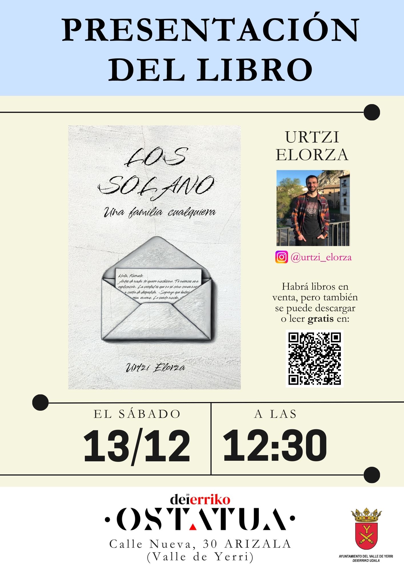 Datorren larunbatean, hilak 13, "Los Solano: Una familia cualquiera" ipuin-liburua aurkeztuko dut Arizalako (Deierriko_ostatua) Deierriko Ostatuan (@deierriko_ostatua).