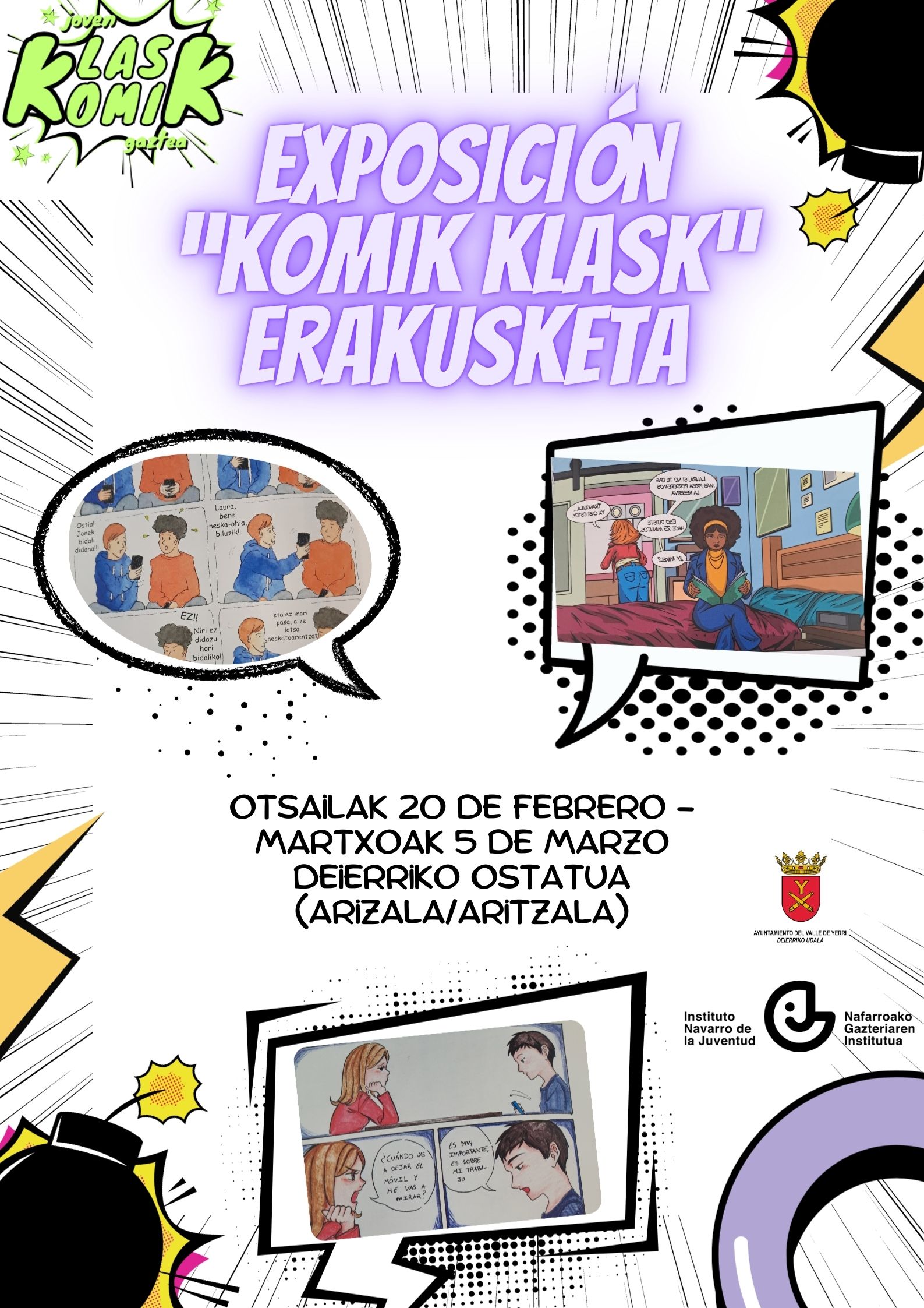 La exposición recoge los cómics premiados en el concurso de cómic joven “Klask” cuyo objetivo es promover la reflexión crítica a través de la creatividad de las personas jóvenes, y fomentar actitudes de igualdad y respeto como base de una sociedad libre de violencia contra las mujeres.
