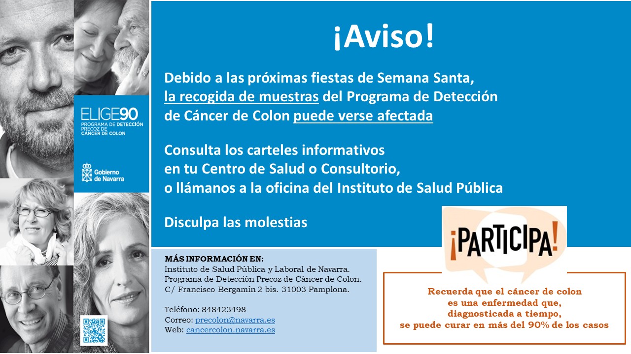 Debido a las próximas fiestas de Semana Santa, la recogida de muestras del Programa de Detección de Cáncer de Colon puede verse afectada.